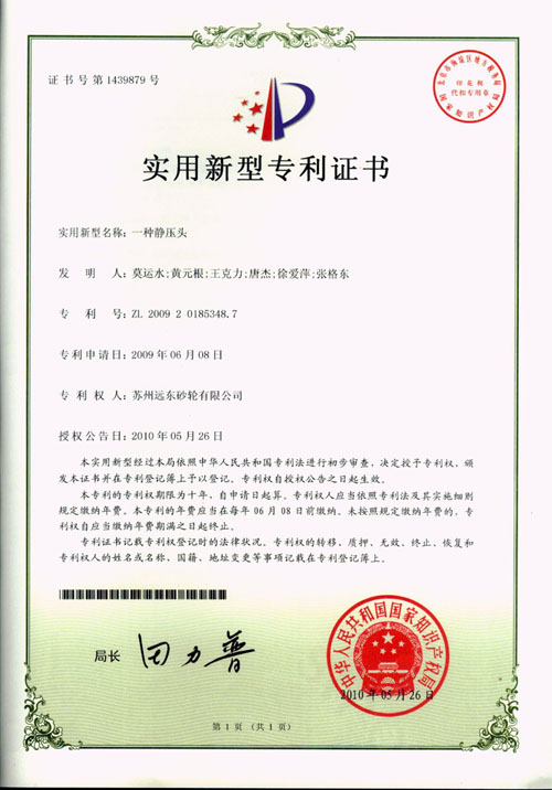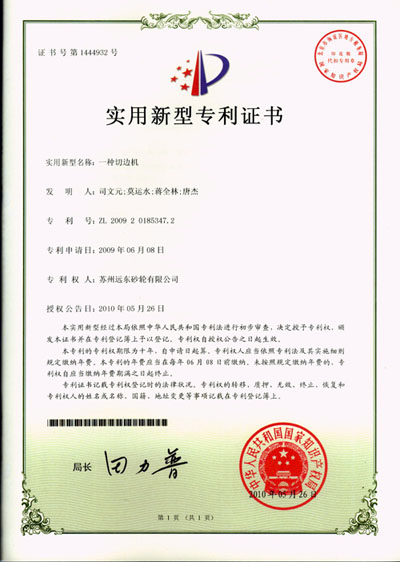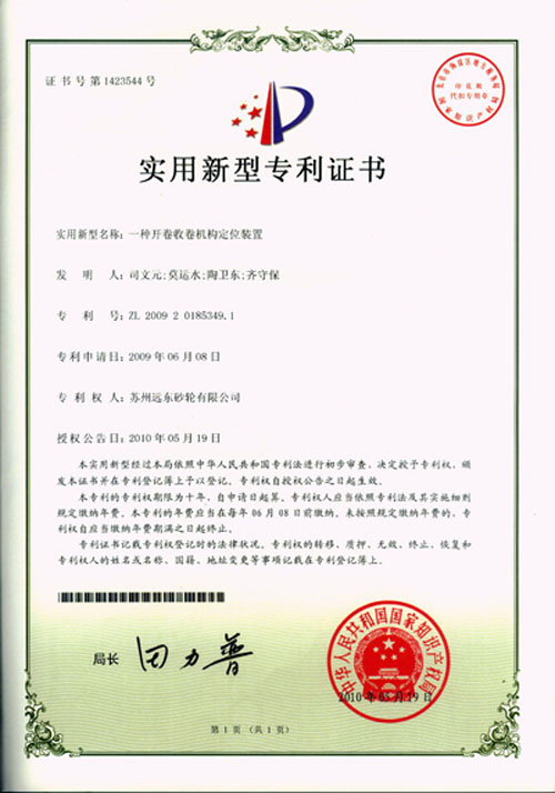 近日,國家知識產(chǎn)權(quán)局審核通過了公司控股子公司——蘇州遠(yuǎn)東砂輪有限公司開發(fā)研制并組織申請的三項實用新型專利(開卷收卷機(jī)構(gòu)定位裝置、設(shè)計的靜壓頭和切邊機(jī)),授予公司專利權(quán)并頒發(fā)實用新型專利證書。(遠(yuǎn)東公司提供)